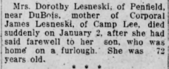 - Vital Records, Death certificate of Dorothy Lesneski, Pennsylvania Department of Health, File No 3012, 2 Jan 1918. View image